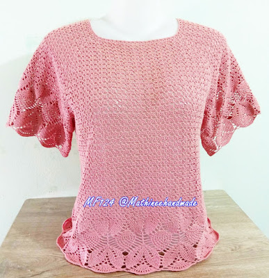 ภาพรวมของเสื้อตัวนี้เมื่อถักสำเร็จแล้วฝีมือพี่เมเอง ดัดแปลงจากภาพต้นแบบที่ได้มาเป็นเสื้อแขนสั้นเพราะชอบแขนแบบนี้ใส่สบาย ใครจะถักเป็นสามส่วน สี่ส่วนตามสบายเลยนะคะ