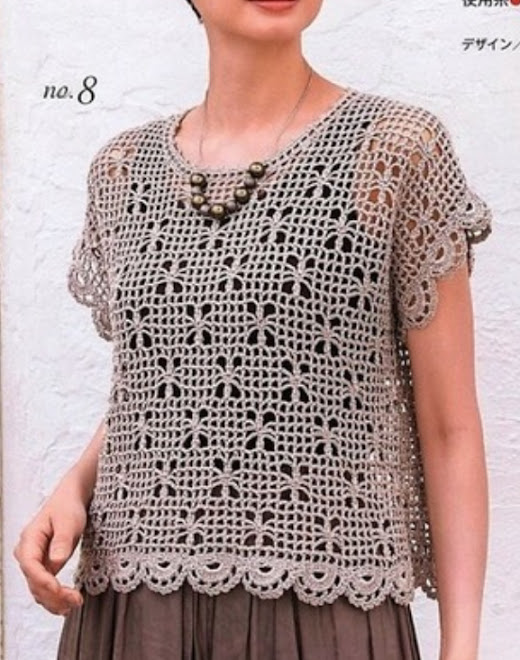 . ถักจากด้านล่างขึ้นด้านบน ถักวนวงกลม ถักลายพื้นฐาน สลับกับลายดอก ตามผังลาย จนได้ขนาดของรักแร้ ความสูงของตัวเสื้อตามชอบ แบ่งงานออกเป็นสองส่วนเท่ากัน เป็นชิ้นหน้าและชิ้นหลัง